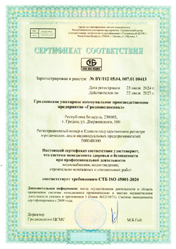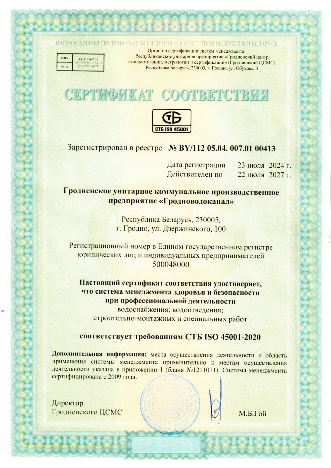 23.07.2021г. получен сертификат соответствия Национальной системы подтверждения соответствия Республики Беларусь № BY/112 05.04. 007. 01 00413, который удостоверяет, что система управления охраной труда деятельности по обеспечению потребителей питьевой водой, отводом и очисткой отработанных сточных вод на канализационные очистные сооружения соответствует требованиям СТБ ISO 45001-2020.
