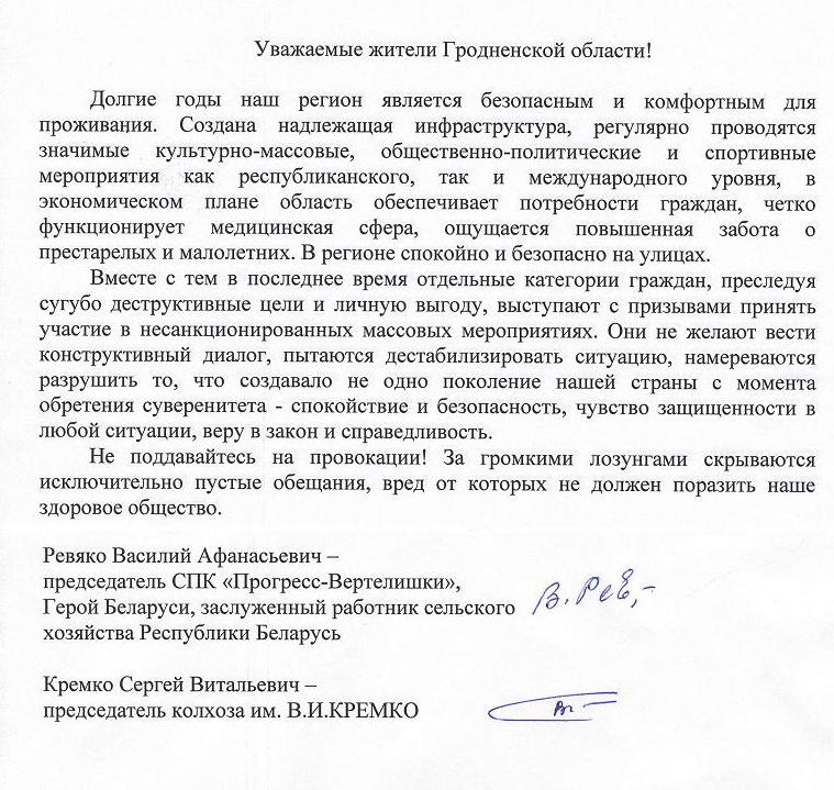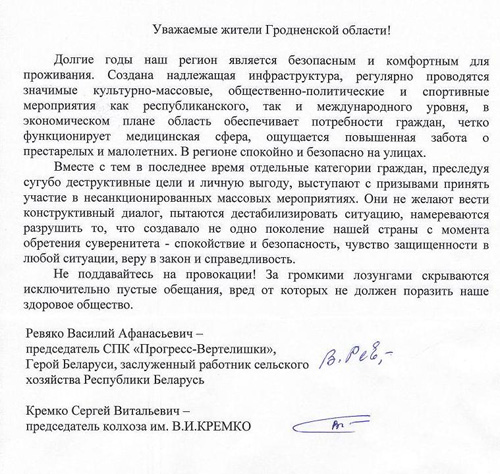 В адрес Гродненского областного исполнительного комитета поступило обращение от заслуженных людей Гродненской области: Василия Афанасьевича Ревяко – председателя СПК «Прогресс - Вертелишки», Героя Беларуси, и Сергея Витальевича Кремко – председателя колхоза им. В.И.КРЕМКО – к жителям Гродненской области.