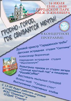 ⦁ С 13.00 до 18.00 состоится культурно-развлекательная программа «Гродно – город, где сбываются мечты!» при участии духового оркестра «Гарадзенскія трубы» ГУК «Гродненская капелла», Александра Воронище, детской эстрадной студии «Септима» и эстрадной студии «Миллениум» ГУ «Гродненский городской центр культуры», школы современного танца «Адепт». В программе мероприятия: показательные выступления специалистов-кинологов вч 5522, работа площадки МЧС, показательные выступления спортивных клубов, розыгрыш призов от пиццерии «Pizza&Coffee» и студии загара «Солнце круглый год», флеш-моб «Гродно-step», работа игровых и спортивных площадок ФОЦ «Олимпия» и ЦТДиМ «Спектр», выставка-продажа сувенирной продукции отделения дневного пребывания Центра социального обслуживания населения Ленинского района г. Гродно, праздничная торговля и т.д. Приглашаем Ваш трудовой коллектив к участию в празднике.