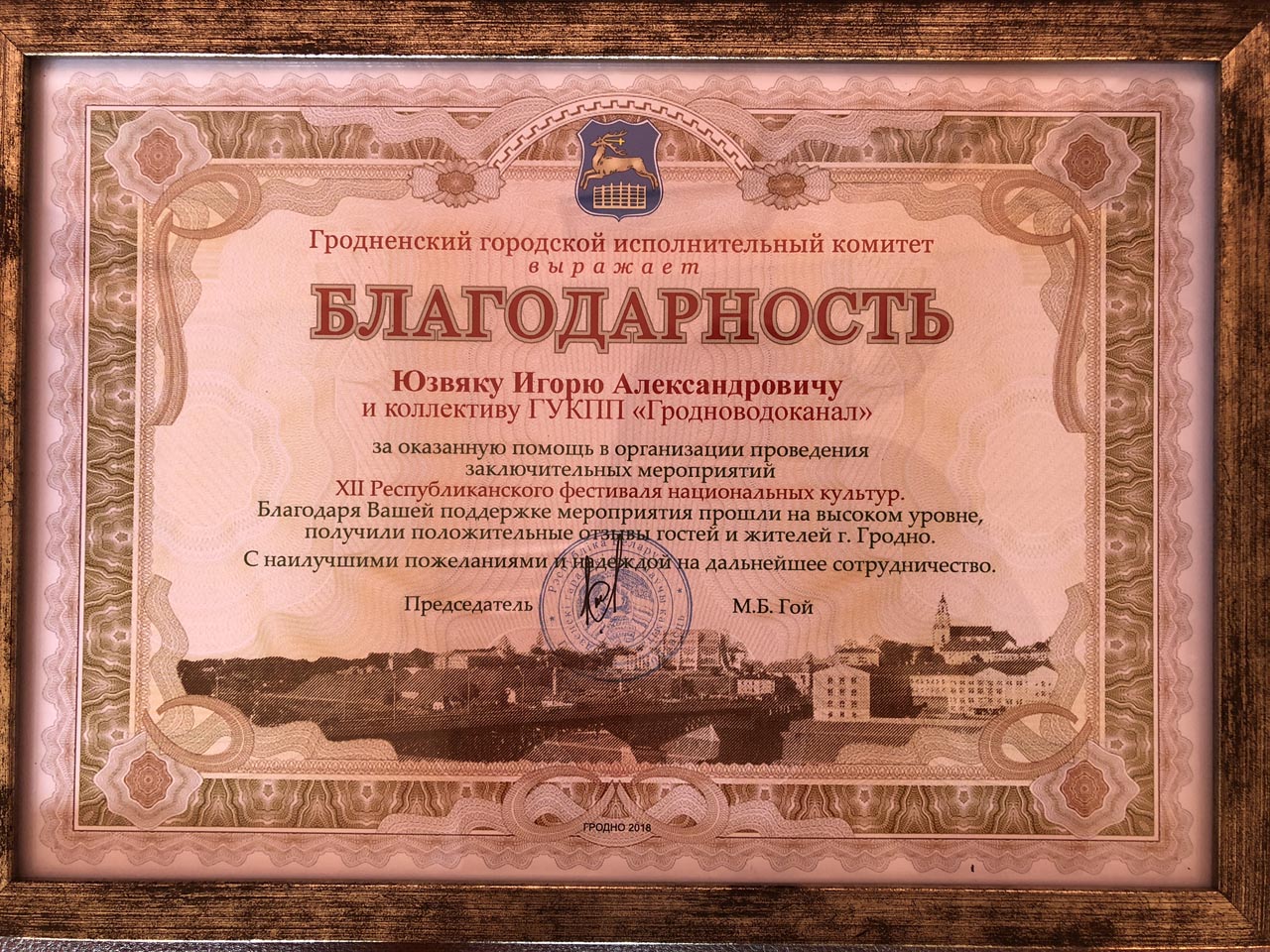 Коллектив ГУКПП «Гродноводоканал» в лице директора предприятия Юзвяка Игоря Александровича также получил высокую оценку своей работы за время подготовки и проведения фестиваля и удостоен Благодарности Гродненского городского исполнительного комитета.