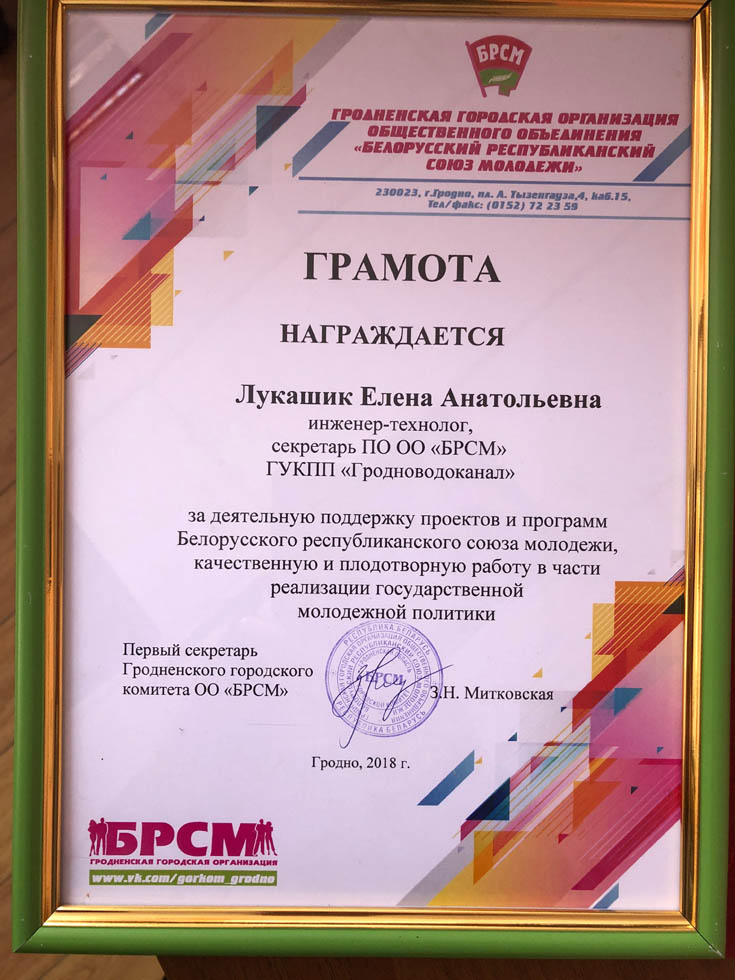 Так же 28 декабря 2018 года Лукашик Елене была вручена грамота за деятельную поддержку проектов и программ Белорусского республиканского союза молодежи, качественную и плодотворную работу в части реализации государственной молодёжной политики. | |