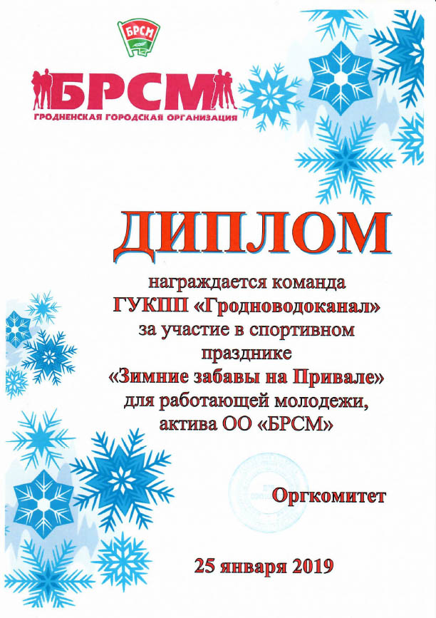 Команда ГУКПП «Гродноводоканал» показала отличные результаты во всех конкурсах, уступила только в перетягивании каната. Несмотря на то, что победителями стали Городской отдел МЧС, ОАО "Гродненская Табачная Фабрика "Неман" и ОАО «Гродненский мясокомбинат», участники команды отлично провели время, получили классные впечатления и вывалялись в снегу!