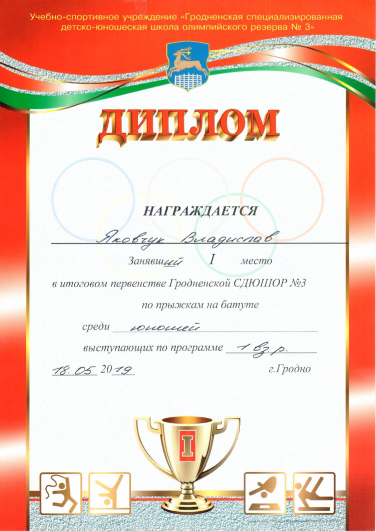 Яковчук Владислав, учащийся 4 «Б» класса СШ № 7 г. Гродно занял 1 место в итоговом первенстве Гродненской СДЮШОР №3 по прыжкам на батуте среди юношей, выступающих по программе первого взрослого разряда, которое проходило 18 мая 2019 года. Благодаря этой победе Владислав прошел отборочный тур и зачислен в сборную команду Гродненской области. Республиканские соревнования пройдут в г. Вилейка в конце мая 2019 г.