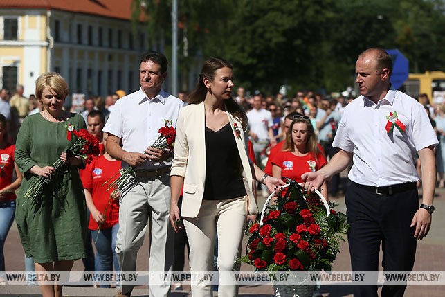 Колонна марафона в центр Гродно прибыла в сопровождении байкеров. Основные мероприятия развернулись в парке им. Жилибера. Участники марафона, представители органов власти, ветераны, жители Гродно возложили цветы к вечному огню.