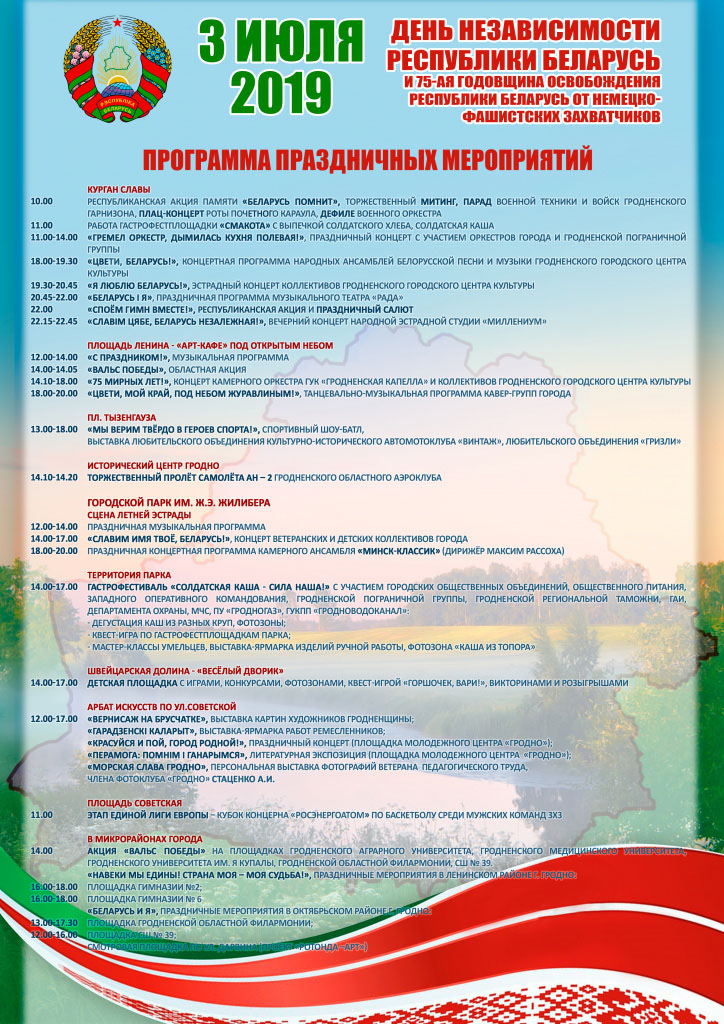 03.07.2019г. вся страна празднует День Независимости. На один день центр города превратился в большую площадку развлечений. В парке им. Жилибера угощали солдатской кашей, на площади Ленина пели народные и военно-патриотические песни, на Советской площади играли в баскетбол, а в небе над исторической частью летал самолёт пишет «Вечерний Гродно».