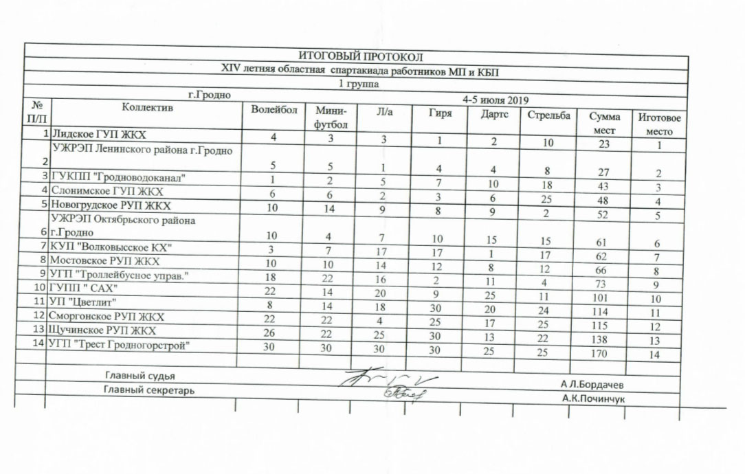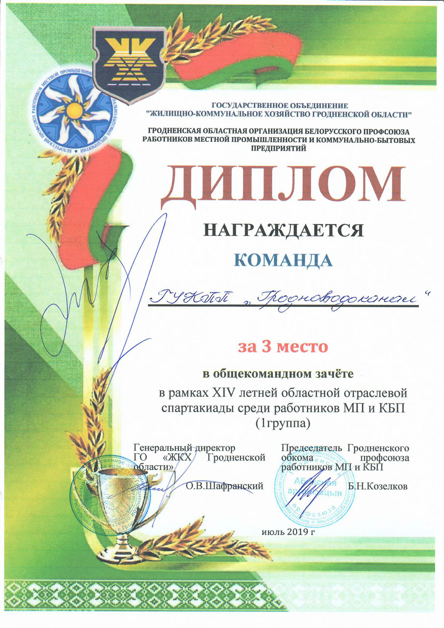 По итогам спартакиады среди предприятий 1 группы ГУКПП «Гродноводоканал» занял почетное третье место, уступив 14 кратному чемпиону области – Лидскому ГУП ЖКХ и УЖРЭП Октябрьского района.