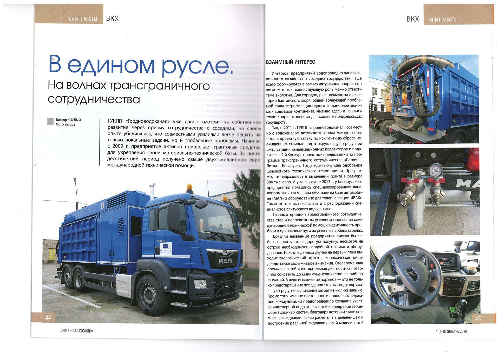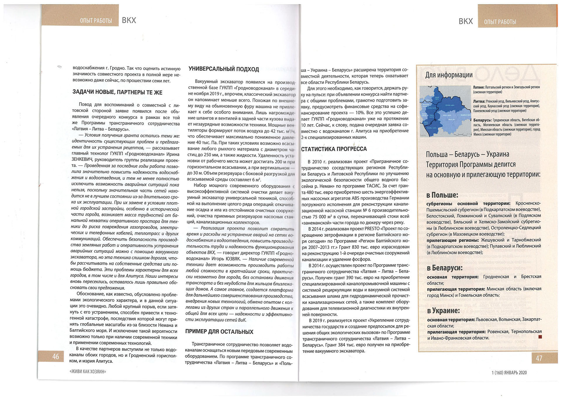 Так, в 2011 г. ГУКПП «Гродноводоканал» совместно с водоканалом литовского города Алитус разработали проектную заявку по исключению сброса неочищенных сточных вод в окружающую среду при эксплуатации канализационных коллекторов и подали ее на 2-й Конкурс проектных предложений по Программе трансграничного сотрудничества «Латвия-Литва-Беларусь». Тогда идея получила одобрение Совместного технического секретариата Программы, что выразилось в выделении гранта в размере 380 тыс. евро. А уже в августе 2013 г. у белорусского предприятия появились специализированная каналопромывочная машина «Assman» на базе автомобиля «MAN» и оборудование для телеинспекции «IBAK». Такая же техника оказалась и в распоряжении специалистов алитусского водоканала.