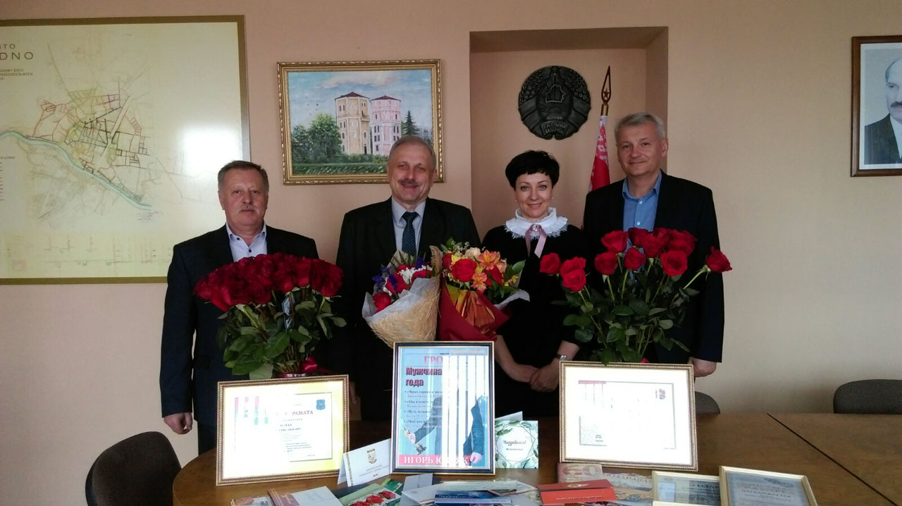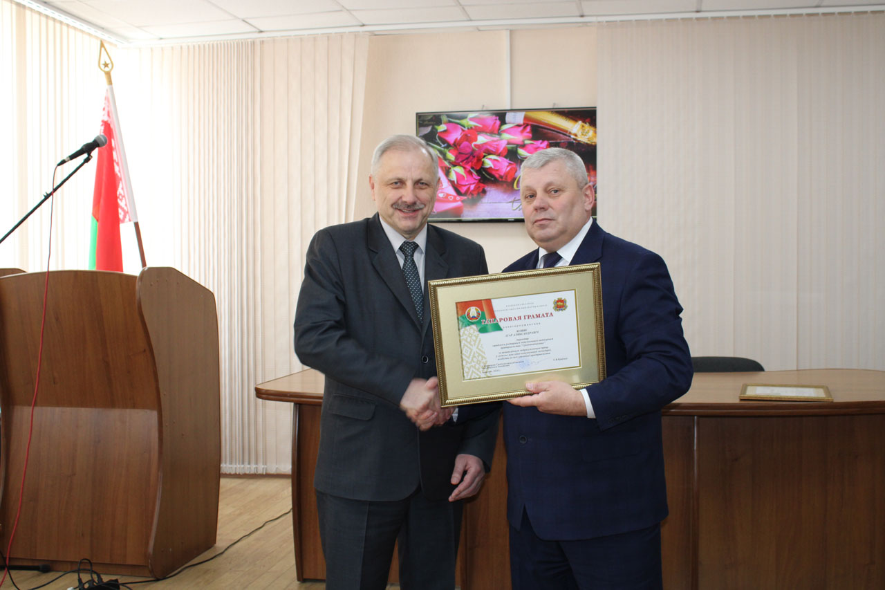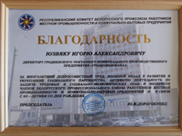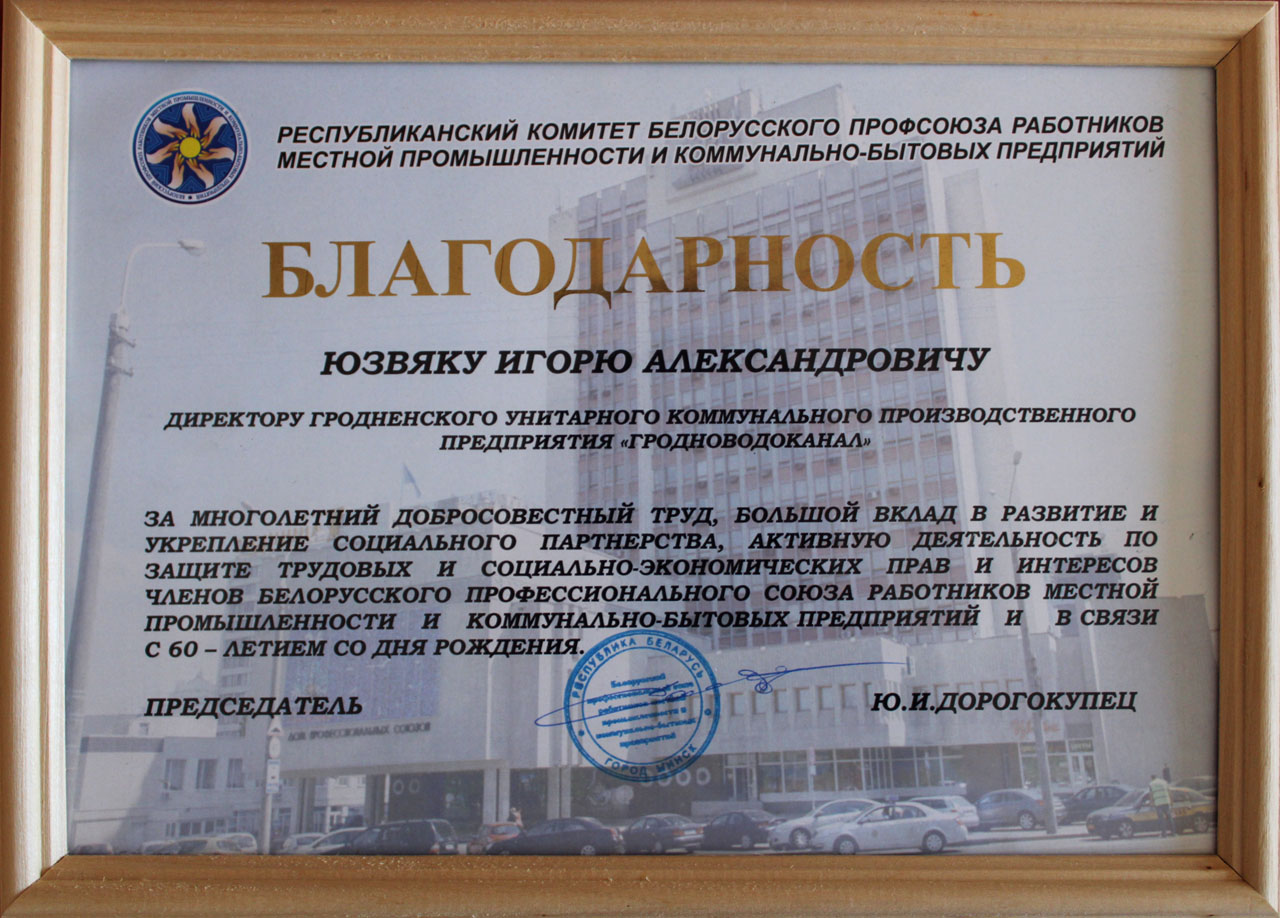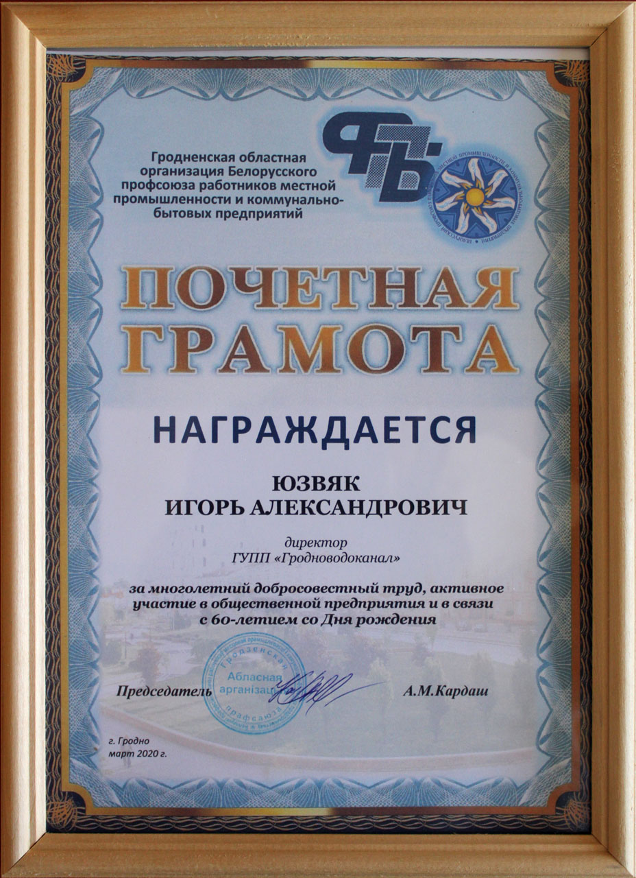 Председатель Гродненской областной организации белорусского профсоюза работников местной промышленности и коммунально-бытовых предприятий Кардаш Андрей Михайлович вручил Игорю Александровичу Благодарность от Республиканского комитета Белорусского профсоюза работников местной промышленности и коммунально-бытовых предприятий и Почетную грамоту от Гродненской областной организации белорусского профсоюза работников местной промышленности и коммунально-бытовых предприятий