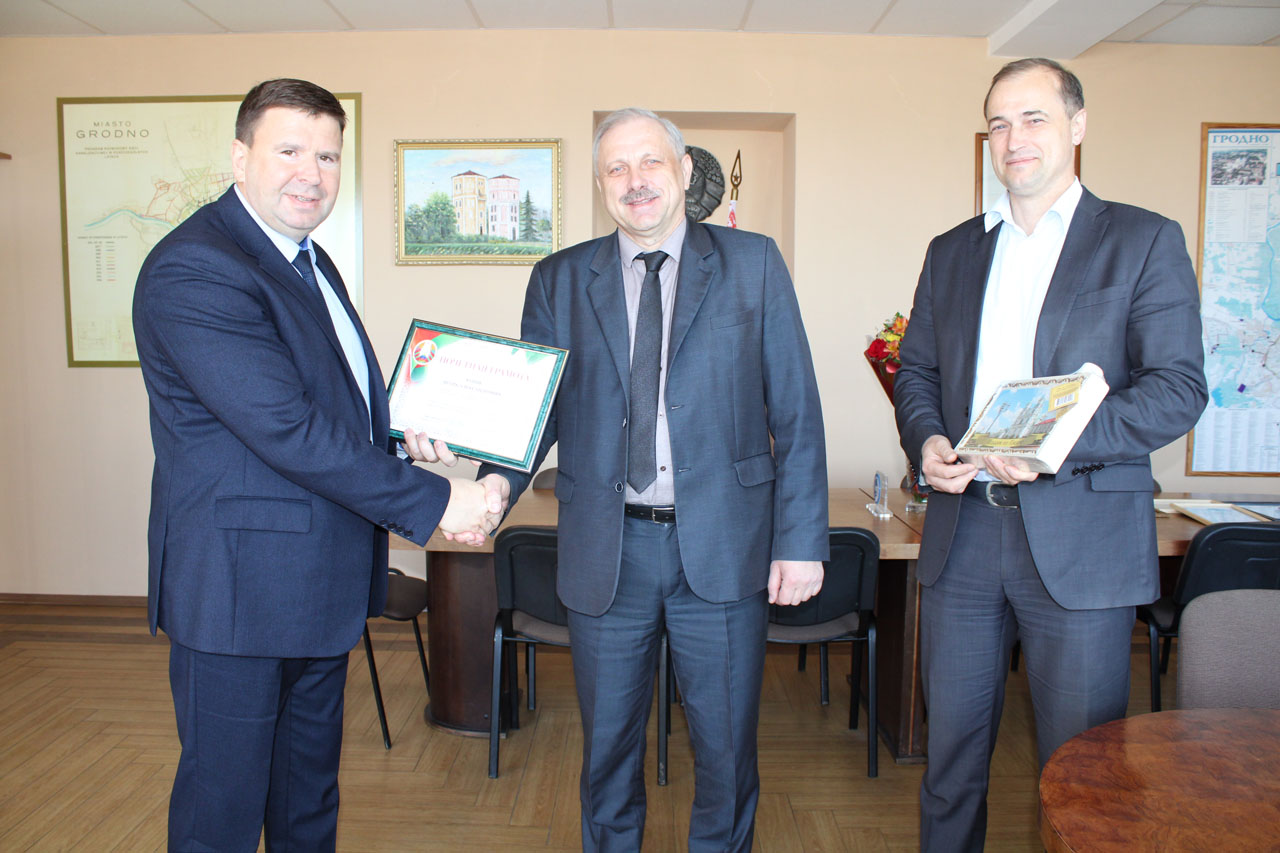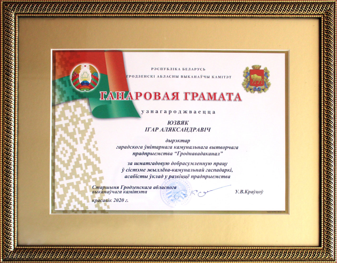 20 апреля 2020 года ГУКПП «Гродноводоканал» посетил Председатель Гродненского городского исполнительного комитета Мечислав Брониславович Гой и первый заместитель Главы администрации Ленинского района г. Гродно Геннадий Антонович Яскевич, для поздравления директора предприятия Юзвяка Игоря Александровича с юбилейной датой 60-летия и вручения Почетной грамоты Гродненского областного исполнительного комитета и Почетной грамоты Гродненского городского исполнительного комитета за многолетний и добросовестный труд в системе жилищно-коммунального хозяйства г. Гродно.