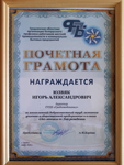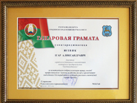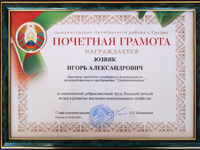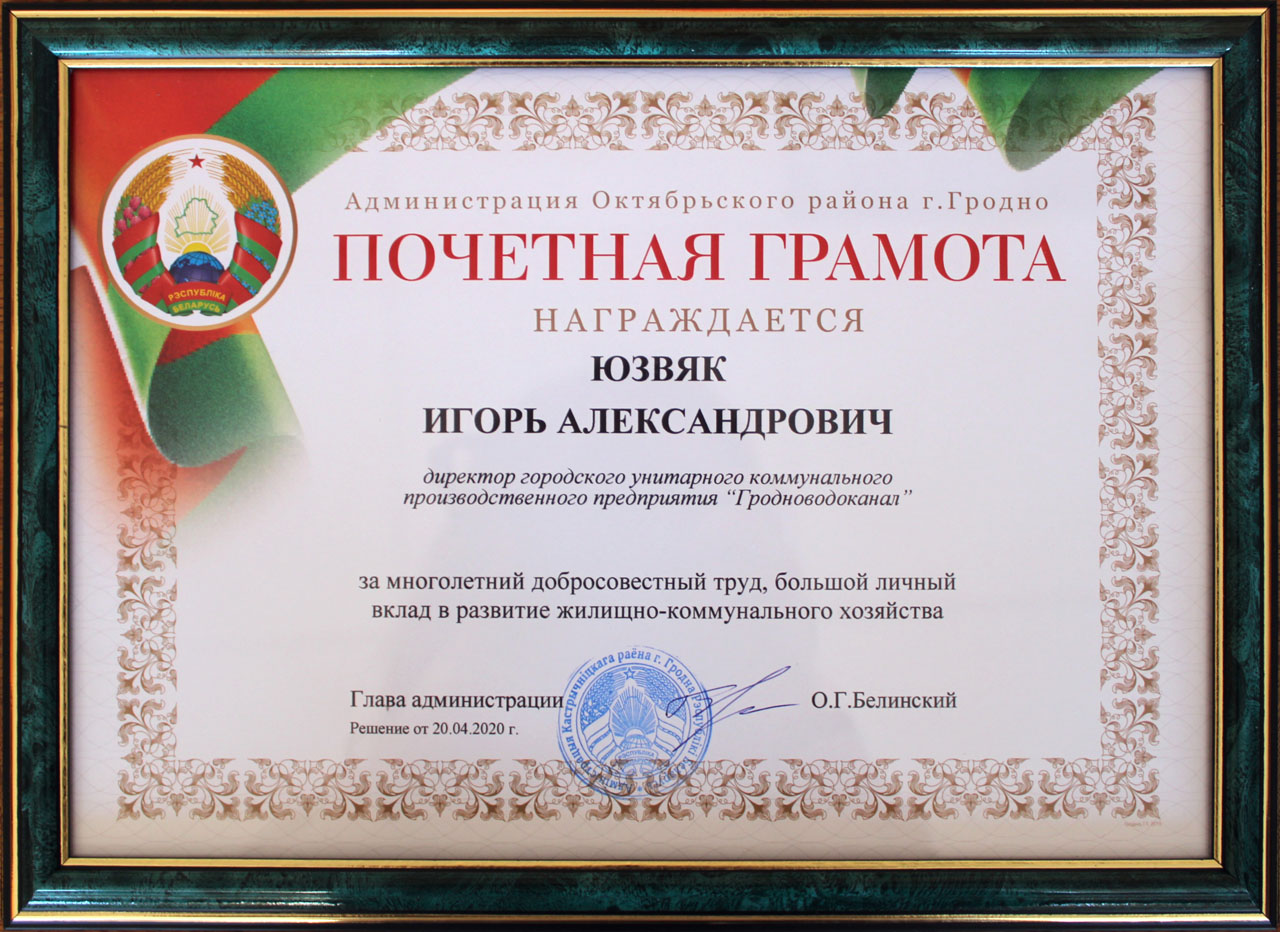 Также Юзвяк Игорь Александрович награжден Почетной грамотой администрации Октябрьского района г. Гродно, которая была вручена Главой администрации Октябрьского района г. Гродно Белинским Олегом Геннадьевичем и Первым заместителем Главы администрации - Сорока Сергеем Александровичем