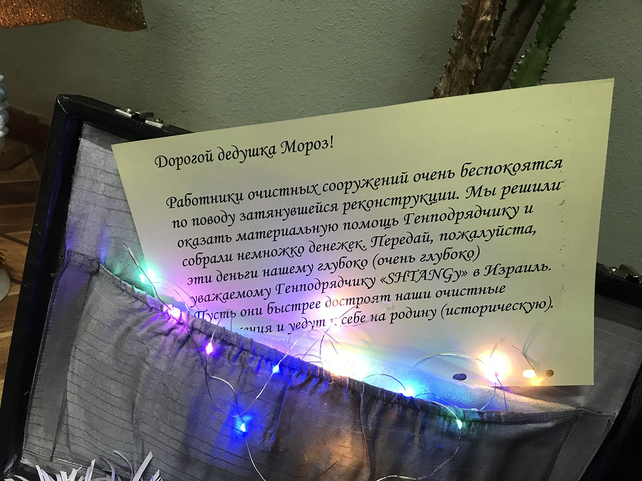 В преддверии новогодних праздников первичной профсоюзной организацией ГУКПП «Гродноводоканал» был организован конкурс среди структурных подразделений на лучшее письмо Деду морозу. По условиям конкурса важной составляющей была «защита» подготовленных работ. Все сотрудники, участвовавшие в конкурсе, проявили свои таланты и фантазию, благодаря которым обычные кабинеты обрели атмосферу волшебства, создавая для себя и коллег праздничное настроение.