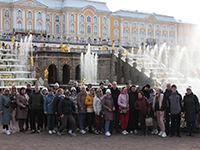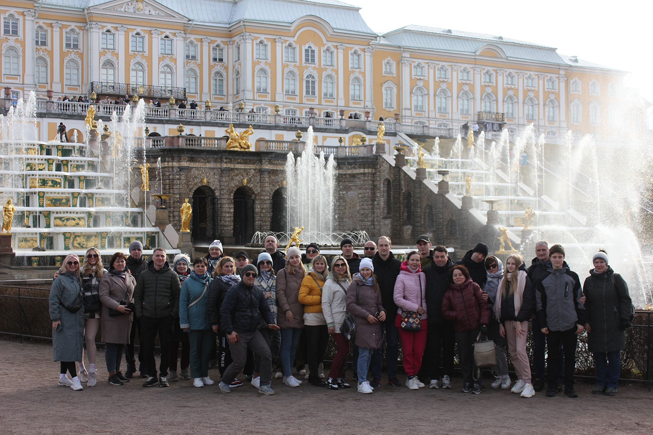 В первый день путешествия состоялась экскурсия «Жемчужное ожерелье Петербурга» с посещением Петергофа – столицы русских фонтанов. Экскурсия проходила и по трассе «Дворцы и парки южного берега Финского залива», и по Нижнему парку «Тайны фонтанов Петергофа», где все смогли полюбоваться более чем 150 фонтанами, золочёными и беломраморными скульптурами, панорамой Финского залива…
