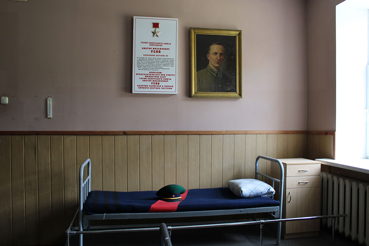 Слева от музея — казарма. Тут, в ряду с кроватями солдат, находится и койка лейтенанта Усова, еще один символ того, что о герое помнят.