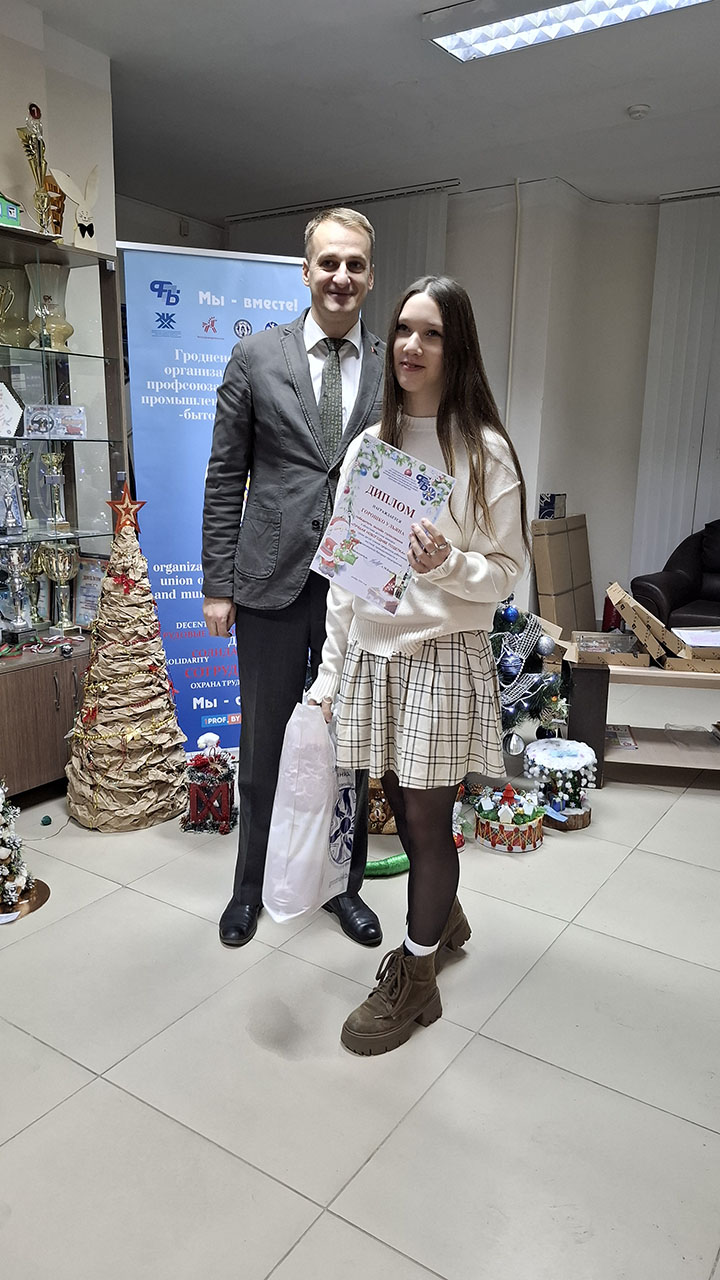 31.12.2024 прошло награждение победителей и призеров председателем областной организацией профсоюза Андреем Кардашом. В старшей возрастной категории Горошко Ульяна ГУКПП «Гродноводоканал» стала победителем онлайн голосования.