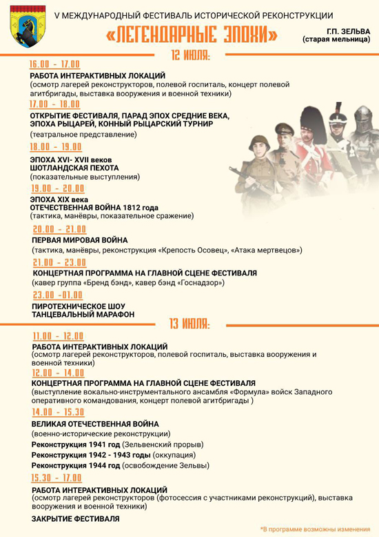 Первый день – 12 июля удивит колоритом четырех эпох: захватывающие рыцарские сражения и увлекательные бои шотландской пехоты, запоминающиеся эпизоды Отечественной войны 1812 и Первой мировой – 1914 годов… Кульминацией фестиваля станет реконструкция героических событий Великой Отечественной войны, которая пройдет 13 июля. В ней примут участие более 200 рекострукторов из Беларуси и России.